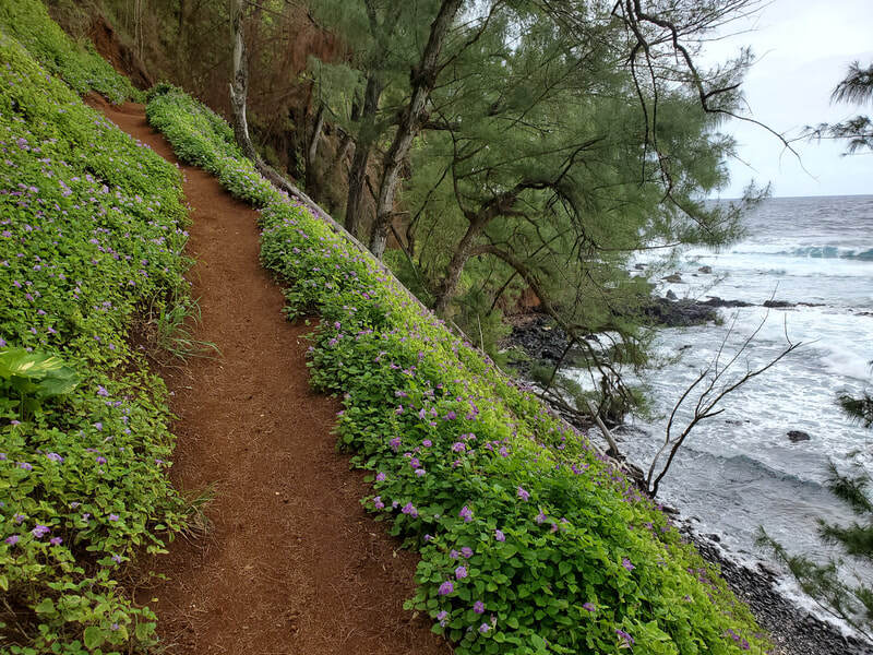 - Ohai Trail - A 1.2 mile loop trail with 200' elevation gain. The trail splits, you can take either direction as it loops around. Great scenic views and popular with hikers, joggers, and a pet friendly trail (leashes and picking up after your pets is required). Lush, low plant growth, and an easy trail with some benches to enjoy the views from. There is a short 300' paved side trail that takes you to an overlook where you can spot whales during whale season. To get here: follow Hwy 30 North out of West Maui, the trailhead can be found between mile markers 40 & 41. Small parking for about 5-6 cars on the North side of the road. No facilities. Bring plenty of water and sturdy shoes.