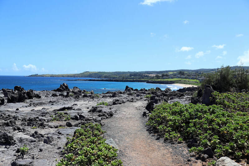 - Kapalua Coastal Trail - A 1.75 mile one way (3.5 miles round trip) trail with little change in elevation. This is a favorite trail on Maui for scenic views along the coastline. You can start at Kapalua Beach or at DT Fleming Beach and walk in either direction; I prefer to start in Kapalua as the first 2/3rds of the trail is the most interesting. After that a paved path takes you across the golf course and Ritz Carlton resort, this is where we usually turn around and head back to Kapalua Bay for some swimming. Paved paths part of the way turn into a dirt & rock pack then into a boardwalk above Oneloa Beach. There is so much to see along this trail including crashing waves on the volcanic rocks and cliffs, turtles swimming in the waters below, the beaches, and more. There is very little shade on this trail so start early and bring lots of water. Flip flops not recommended. To get here: park near Kapalua Bay, opposite the Ironwood gates at Oneloa Bay, or at DT Fleming Beach Park.